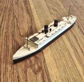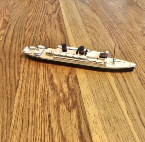 Van Ryper. When one thinks of models of ocean liners, this is one name that stands out. This is a Van Ryper model of the Dollar Liner ss President Hoover of 1930. The ship and line had a storied history. She was accidentally bombed in August, 1937, and in November of that year ran aground during a typhoon near Taiwan in 1937 and was declared a total loss. The bigger story was the demise of the Dollar Line itself and the subsequent creation of American President Line. I just like the name and the $ logo. In excellent condition measuring about 9.5″ long.