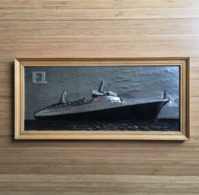 Impressive framed plaque made for Queen Elizabeth 2’s entry into service. Obtained on her maiden voyage and in excellent condition. I’ve never seen another. This QE2 plaque measures about 16.5″ x 8″ including the original frame. This item comes from the collection of Ron Johnson, Operations Manager of Cunard Line in New York. He started with the company in 1926 and retired in 1971. I recently purchased all of his Cunard and White Star memorabilia from his estate, and it will be put on Luxury Liner Row over the next few months.