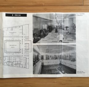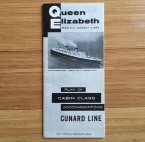 Cabin-class plan for the largest ship in the world. Dates to the 1960’s. Well illustrated and folds open to 32″ x 8½”. In very good condition.