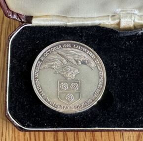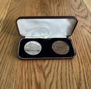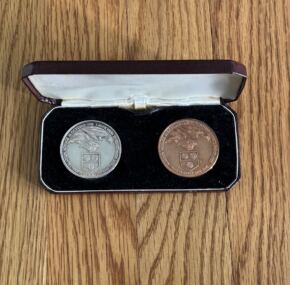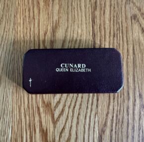 When Cunard Line’s famous RMS Queen Elizabeth was exiting service, Netonia & Tarbox, Ltd., struck a set of commemorative coins to mark the occasion.   One is sterling silver, and the other is copper.  This set is 91 of 500, and they are thus marked on the coins themselves.  These were only sold on board at the very end of the ship’s career.  They are in excellent condition in their original box.  Very highly sought after.