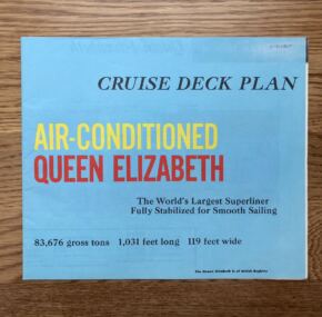 Color-coded cruise deck plan for the world’s largest liner, RMS Queen Elizabeth. I haven’t had this version before in fact I have only had one other version and this one is nicer. It shows the ship well. Measures about 34″ x 7.5″ and in near mint condition. Don’t we all wish that Cunard could have kept her in service till 1975 as they planned!