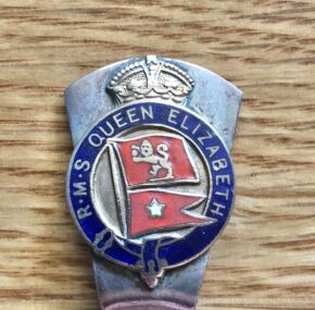 Silver loose-leaf tea spoon as sold in the souvenir shop on the great Cunarders. No damage to the enamel , and just a bit of wear to the silver plate. These display nicely as does just about everything from the gift shop!