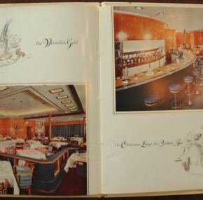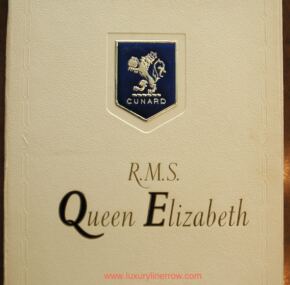 First-class travel can be relived in this fantastic hardbound booklet available to passengers in the on-board gift shop. Sixteen glossy images, most are full-color photos. At the back there is a thoughtful pocket to keep your menus and daily programs in. Near mint condition with no roughness to the embossed Cunard logo that is often seen. These are quite nice and are well made. I wish they had produced books like this for Caronia and the second Mauretania. Only the Queens seem to have been so favored. Still in its original envelope!