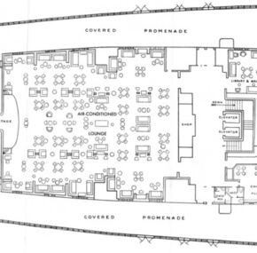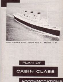 Cabin-class deck plan for the Queen Mary. Contains numerous interiors and one exterior photo, this plan folds open to 38″ x 8½'”. A quantity available.