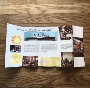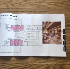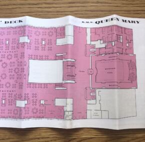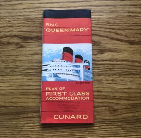 Glossy full-color first-class deck plan for the RMS Queen Mary from the 1960’s. Shows all the changes made to first class throughout the post-war years, including the Observation Bar and the forward first-class cabins on A and B decks being given to third class. The plan is in excellent condition with very little scuffing. These are quite hard to keep in stock, and I have sold dozens over the years. I have just now gotten some back in stock. Take it with you next time you are on the QM. Taking a deck plan along with you is a fun way to explore the ship.