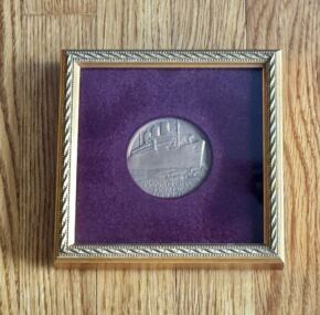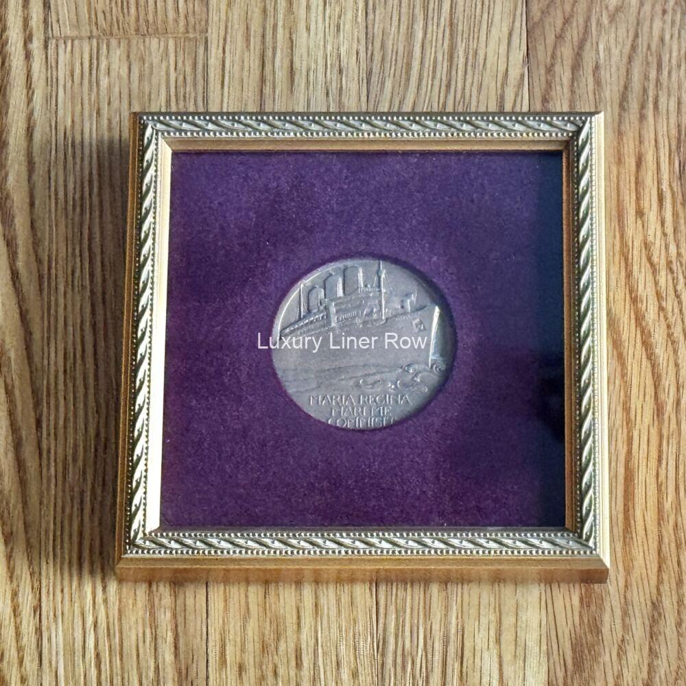 The French Line went for commemorative bronze medallions in a big way. More than five were produced for Normandie alone. Cunard? Not so much. They could not resist doing a medal for the Queen Mary, however. And what a medal too. This fine bronze medal was designed by Gilbert Bayes and was made by the Royal Mint in a limited quantity of 3,000. The obverse is a three-quarter bow view of the Queen Mary, and the reverse is a view of New York City through the old Bargate of Southampton. Very cleverly done! The back also incorporates a Cunard lion and a White Star in a fashion I had never seen before. Nicely framed with a red velvet matte. Frame measures about 6.5″ square. AC