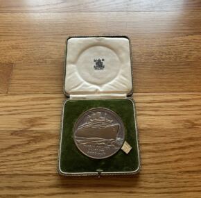 All this contained in the original leather presentation box that is silk and velvet lined. According to sources in the UK, Cunard gave many of these medals away in 1936, including a number to key people at John Brown. When the ship was leaving service in 1967, Cunard found a number of these medals still in storage. They decided to sell them on board in that last year of service but at 1936 prices!