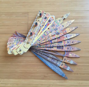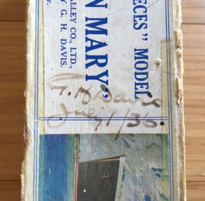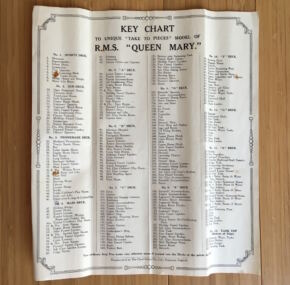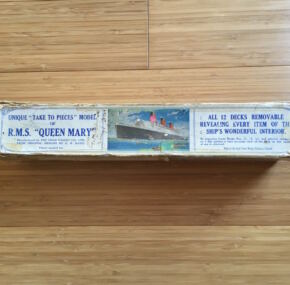 One of the most collectible items ever made for the Queen Mary. A Chad Valley take-to-pieces model. As you can see from the photo, each deck pivots revealing a detailed color-coded deck plan, handily numbered for use with its corresponding key chart, which is included along with the original box. The key covers 240 areas on the ship. What makes this one extra special is that it is signed on the box by the designer of the model GH Davis and dated July, 1936.