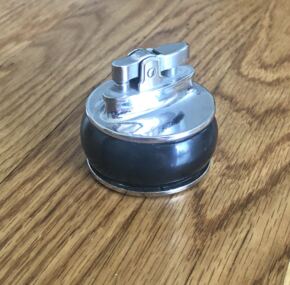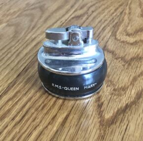 Rolestar table lighter from the souvenir shop on board the RMS Queen Mary. Our favorite Cunarder had these lighters in several colors, but I think this black version is the classiest. In excellent condition.
