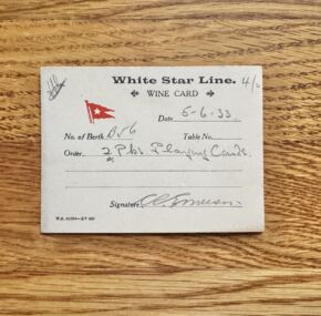 The old ships, of course, didn’t have your charges secured by a credit card or a way to link your purchases with your room key. Cash was king, and you settled up your bill at the end using receipts like this. Despite it saying “Wine Card,” this cards were used for all manner of things. All the paperwork that was necessary on the old liners is mind boggling to think of today. Sadly, so little of it survives. Probably identical to what was used on RMS Titanic.