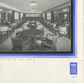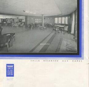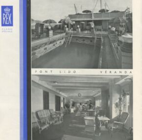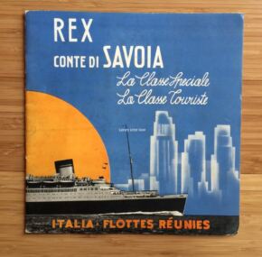 Fantastic 28-page brochure for first and tourist class on the famed Rex and Conte Di Savoia. Dated to 1934 and in very good condition. Very interesting photos as they are little seen. Half the brochure is for Rex and half for Conte. Many nice shots with models which always show interesting sections of the rooms in use. This brochure is a great way to compare the two Italian ships of state. I have my favorite…. Which is yours? In French. Some slight foxing on the cover which does not detract and the slightest of water staining on a few pages near the base of the brochure.