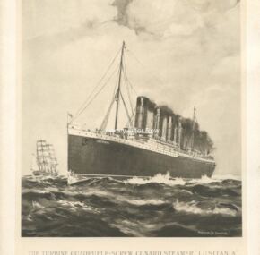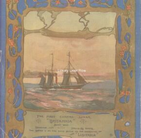 Launched by Mary, Lady Inverclyde, in June, 1906, Lusitania set new standards for speed, size, and luxury on the Atlantic. But then you knew all that! Cunard and John Brown went all out for Lusitania’s launch. They produced a beautiful launch invitation and put on quite a special luncheon, splitting the cost of the luncheon. Norman Wilkinson even did a painting of Lusitania sliding down the ways to give to Lady Inverclyde. Inside the invitation is the original insert, which shows a painting of the ship by Arthur Burgess as she would appear when complete. Measures about 9½” x 7½”. Needless to say this is a highly sought-after invitation to the launch of Cunard’s innovative record breaker.