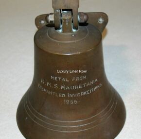 Fantastic brass bell made from metal salvaged from the second Mauretania at the time of her scrapping late in 1965. Here is your chance to own a piece of her. Cunard saved little from their ships sent to the scrap heap in the 1960’s. Which is sad considering what a mass exodus the fleet endured during those years. Extremely well made weighing in at about 8½ pounds! Measures about 8″ x 6¾”. In excellent condition with a nice clear ring. I have not polished it leaving that to the new owner should they so desire. It would gleam with a good polishing though. Super rare.