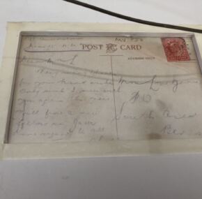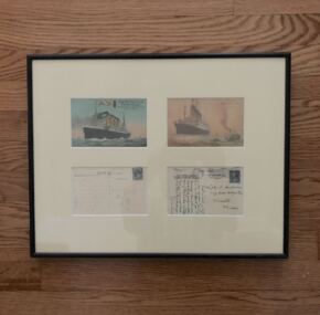 Here is something it took me years to find. A pair of post cards– one mailed from RMS Olympic’s maiden voyage in June, 1911, and one mailed from her final voyage in October, 1935. Framed and matted so you can see the messages and postmarks on the back of the cards. My new home has less space to display framed things; so my loss is your gain. This is an asset to any White Star Line and or Olympic and Titanic collection. It would take you many years to get the beginning and the end of this famous vessel. Call it the Alpha and the Omega for one of the most important ships to ever sail. Overall size, including frame, is 18.5″ x 15″.