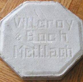 I’m very proud to offer one of the rarest items I have ever had for sale. Manufactured by Villeroy & Boch (founded in 1748 and still making bathroom fittings to this day), these tiles belonged to a lady whose grandfather worked at Jarrow and brought these home during Olympic’s demolition. They have been in the family’s possession ever since. Measuring about 7″ across and almost 1″ thick, each tiles weighs almost 2½ pounds!
