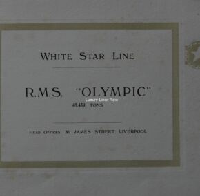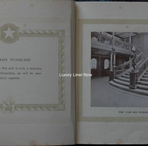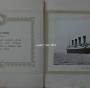 Produced by White Star for use in travel agents’ offices, this hard-bound travel agency counter book is the best brochure ever produced for Olympic. Counting this particular copy, I know of only two examples of this book, and this copy is in much better condition than the other one I know about. The book runs 72 pages and sports 33 photographs — each tipped in by hand. It is printed on very thick, high-quality paper, and the cover has a slightly raised White Star flag with an embossed company name. If you collect Olympic, this is almost a one-of-a-kind item that your collection should not be without.