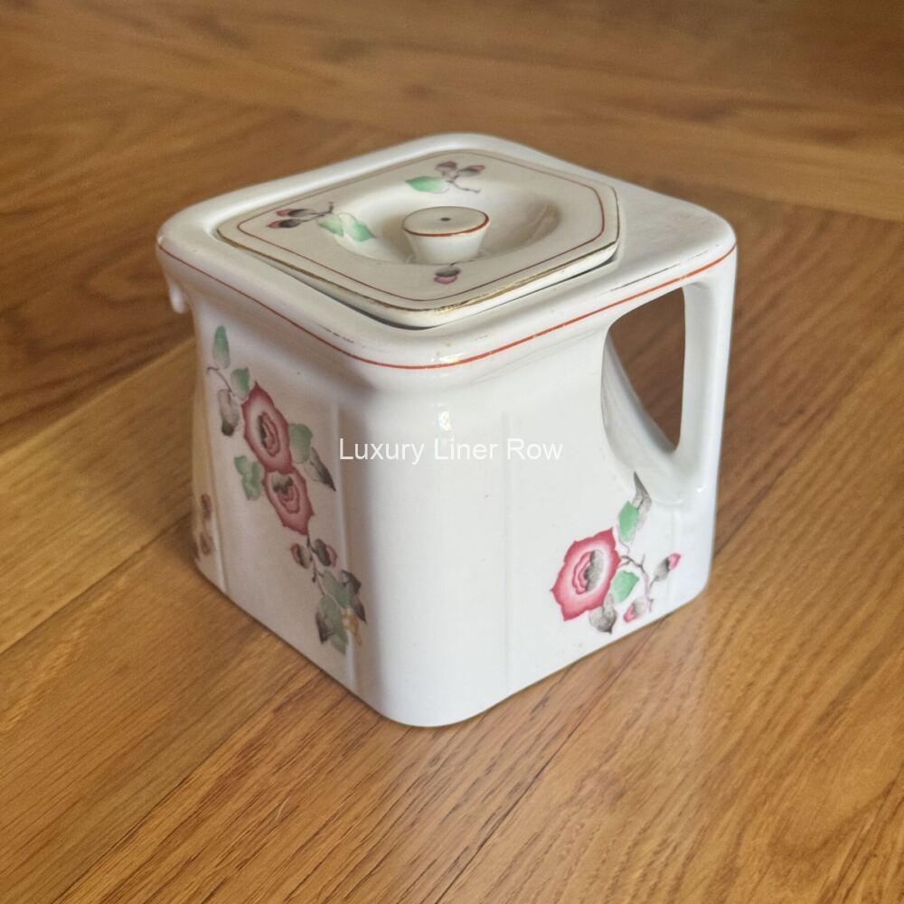 Lovely individual tea pot in the rose pattern. Most people don’t know that this pattern appears to have only been used on ss Media and ss Parthia! This jives with why this particular china pattern is harder to find than other post-war services for Cunard. Measures about 3.5″ x 3.5″ x 3″ tall. No chips, cracks, or crazing. Made by Grosvenor. JF