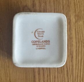Lovely waste dish from the tea service produced by Copelands in the famous rose pattern.  It seems that this pattern appears to have only been used on Media and Parthia.  About 2 5/8″ across and is nearly 1 5/8″ tall. Bottom marked with the Cunard White Star logo. Excellent condition.  Probably the best you’ll ever see.  JF