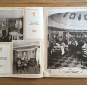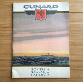 Large size brochure for the brand new ss Scythia, ss Samaria, and ss Laconia. Cunard called them “Ships of the Future!” Doubtless hyperbole but necessary additions to the fleet depleted by 22 ships lost in WWI. Great cover art on this uncommon brochure. In excellent condition.