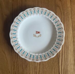 One of the first pieces of china in my personal collection was a White Star Line china side plate just like this one. These lovely plates display so well and I have a soft spot for them. They are made of fine-bone china like almost all White Star first-class dinnerware. Plates like these were on the table when the diner was first seated. See them in use in the archival photo I included of Olympic’s dining room. The pattern that we all know so well was made famous by its use on RMS Titanic. Measures about 7″ in diameter. In excellent condition with no chips or cracks. Has only a few utensil marks and some light staining.