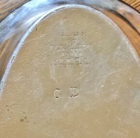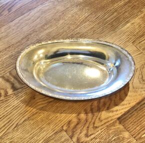 A useful silver bread tray by International Silver and date coded to the maiden voyage of the ss United States. Of particular interest is the “CD” stamped into the bottom of the piece. This is thought by collectors to denote the cabin-class dining room. Since the silver pattern used in all three dining rooms of the ss United States was the same, it was easy after scrubbing up to put too many bread trays into a single spot and thus short changing the other dining rooms. This little physical note was a reminder to properly supply each dining room. Measures about 9.75″ x 6″.