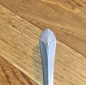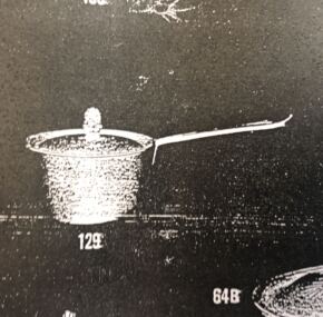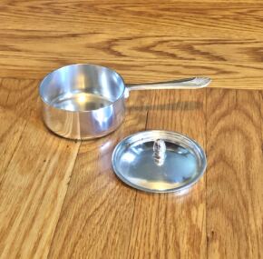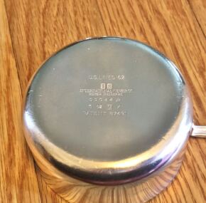 What a cute and interesting item of United States Lines silver. The inventory list for the silver used on board the ss United States shows this marked as a “casserolette.” I suspect this was used for several different types of things, but mostly for table-side sauces like hollandaise, which is only good served hot. Traditionally, it is made table side to both ensure quality and for a little flare in the service. Imagine the head waiter working so carefully to get the sauce just right for the Duke and Duchess of Windsor’s eggs one morning on board. Measures about 6″ long from handle to rim. Made by International Silver and date marked 1952. Excellent condition. Comes to us from the estate of Dr. Sarah Forbes.