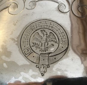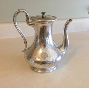 Beautifully made and extremely rare coffee pot from the earliest days of the American Line. Dated 1873, which is the first year the American Line brought ships into service. They built 4 ships — the Pennsylvania, Illinois, Ohio, and Indiana — all named for states along the route of the Pennsylvania Railroad, which helped bankroll the new venture. Comes with the paperwork I found inside the pot that mentions the family of antique dealers in NJ where this was found. It was in the attic! In very good condition considering its age. Very little loss to the silver. It measures about 8″ x 8″.