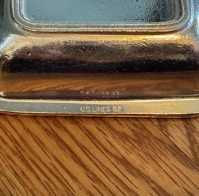 One of the best things I ever found was a silver, china, and crystal inventory for items used on board the ss United States. It has helped me immensely over the years figuring out what items were actually called, and this is a case in point. It is listed in the inventory as an “escoffier dish.” Whoever would have guessed that name? And what exactly was it used for? These are not at all common. It measures about 6 3/8″ from handle to handle. Made for the United States Lines in 1952 and dating to the maiden voyage of the ss United States. It is in great condition.