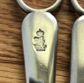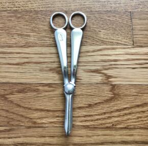 Don’t we all pine for the days when something as simple as grapes were cut table side by the obliging steward. Isn’t that a major reason why we collect fine ocean-liner memorabilia? Enjoying, however fleetingly, the “good o’le days”? While the days of serving vine ripened fruit, with silver implements, and gloved table side service has largely been assigned to the scrap heap of history, you can in your own way enjoy that time again with these Elkington Plate Cunard Line grape shears. Manufactured in 1919 and in excellent condition. They measure about 7″ long.