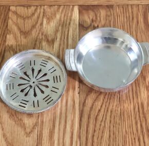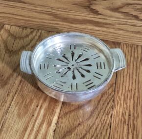 Silver iced-butter dish as used on the famed Queens. Bottom dish is marked Cunard White Star and dated 1936 so made for the maiden voyage of the RMS Queen Mary. Both dish and insert are made by Elkington. Iced butter is still served at dinner on the Queen Mary 2 in dishes similar to this today, but they aren’t silver plated. In very good condition with just typical use marks and a few slight dents on the underside of the lid which are not noticeable when displayed. This will really enhance your tableware collection, and I find most collectors are very drawn to them.