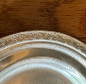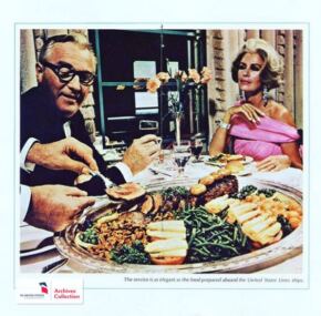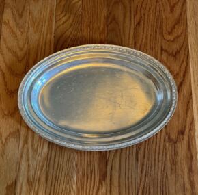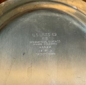 Were you aware that there were 6 different sized meat dishes (platters) provided by International Silver to the United States Lines?  The line chose various sizes from 10″ to 22″ for use on board the Big U.  This platter is the 12.5″ size.  The silver pattern on board the Big Ship is, in my opinion, one of the finest used by any transatlantic company.  Dated 1952 and in very good condition with some typical use marks and scratches.  A nice size to display or even use as a card tray, etc.  Measures about 12.5″ x 8″.  Several available.