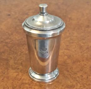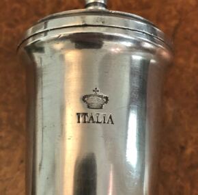Lovely pepper grinder for Italia with a pre-war crown logo so likely to have been used on the ss Rex or ss Conte di Savoia. No loss to silver and extremely rare. This will highlight any collection for ocean liners and/or the Italian Line. Made in Milan with a maker’s name that is somewhat hard to read. I bet one of you out there knows that info right off the top of your head. Stands about 3.5″ tall.