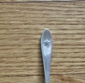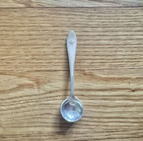 White Star Line salt spoon made by Elkington Plate and dated 1922. In the tear-drop shaped-handle made for Olympic and Titanic. Has the confounding Maltese cross on it. In excellent condition and measures about 3″ long. One of the harder-to-find piece of White Star silver. JF