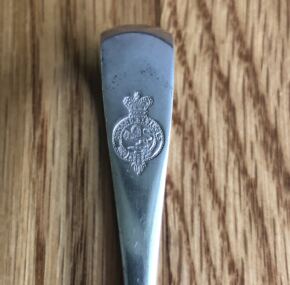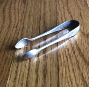 Cute sugar tongs by our old friends at Elkington and Company. Dates to 1905; so they were probably made for one of the “Pretty Sisters,” Caronia or Carmania. In very good condition and measuring about 4″ long.