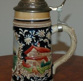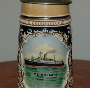 When I think of a German beer stein, this is the look that pops into my head. Steins like this were and probably still are a “required” purchase for anyone who visits Germany. Stands about 9″ tall and 5″ from handle to front. From the on-board gift shop of the Bremen. In excellent condition. Oktoberfest anyone?