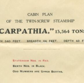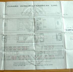 WOW! Amazingly hard-to-find deck plan for Cunard’s famous Carpathia, dated September, 1908, and listed as a “cabin plan.” Looking at the plan, it appears that first and second class were combined into one at some point, perhaps when she was put on the Hungarian service.