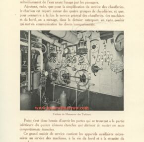 Examples of the photos include your typical public rooms, but there are also shots of the bridge, turbine starting platform, boiler room, the children’s playroom, and hydrotherapy room. Of course, the book also has the obligatory full-page color center spread of the ship at sea. Readily apparent from the pages of this brochure, is that France was one of the most luxurious liners on the Atlantic. What many people don’t realize is that she was also one of the fastest ships of her time.