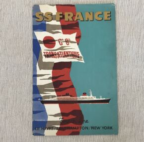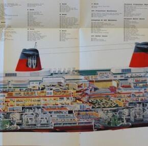 Coming in at a massive 46″ long, this is an amazing cut-away. In full-color, 232 items are listed in the extensive key. It is sad to think that this magnificent liner is now gone. As troubling as that is, you can still hang this French beauty on your wall. Very good condition with some bumped corners and a bit of dirt and some small stains on the back cover.