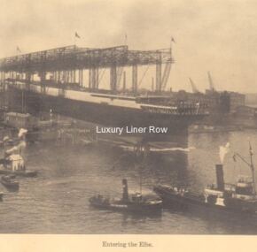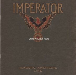 Extremely rare pre-maiden voyage brochure for HAPAG’s latest and greatest triumph, the Imperator. 20 pages with 24 images, including a photo of the Kaiser on the launch platform with the bottle breaking across the bow, the launch, the liner afloat for the first time, 17 (yes, 17!) interior renderings, and a double-page keyed cut-away. “The world’s largest ship embodying maximum comfort and safety for all.” Near mint.