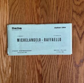 Excellent deck plan showing all three classes. Very detailed, even down to the placement of furniture in each cabin. Unfolds to 27” x 26” and includes several interior and exterior photographs. Great photo of the liner on the back cover. Various dates. A quantity available.