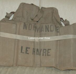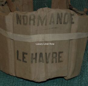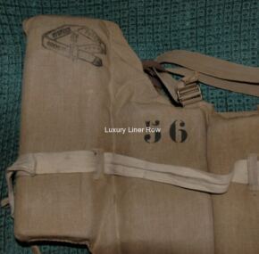 I’m pleased to be able to offer this life jacket from France’s greatest liner. Canvas over cork with “Normandie,” “Le Havre,” and the number “56” stenciled in black. What appears to be a maker’s mark stamped on it. All the ties and buckles in very good condition. Some very slight staining on the canvas. Displays wonderfully. I tried it on, and it fits!