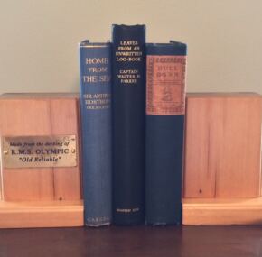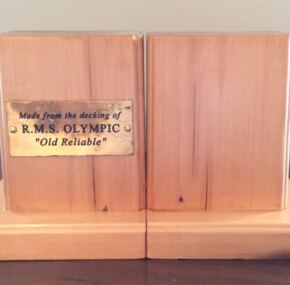 Several years ago, I had a number of sets of bookends made out of decking from the Olympic. Each pair of bookends is identical in design although they are slightly different in size and of course, the graining is different because five three-foot lengths of decking were used to make them. Each set of two matches and was made from the same section of decking. They really look sharp and are very handy for your liner books. I am keeping a few sets for my own collection and find them very useful!