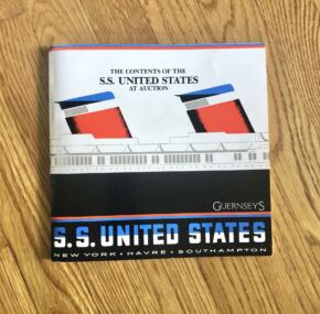 Ever wondered what it was like to auction an entire Ship of State? Well, aside from a lot of work, the answer is in this huge catalog. Nicely illustrated and worth the purchase price alone for some of the archivals that Guernsey’s trotted out from the china, silver, and crystal suppliers catalogue. Extensive and impressive listing for this multi-day auction. I have been told that it is nearly impossible to truly clean out an ocean liner and this was borne out last April when I visited the ss United States. Despite having most of her interiors gutted, there are still hundreds of interesting items on board. The catalogue runs 96 pages and contains over 3,750 lots of items. The sale was billed as the largest auction of all time in 1984. What wouldn’t any of us give to back in time to this auction with a truck load of money? In very good condition.