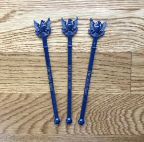 Several years ago, I was called to help clean out the Dr. Forbes estate. This process took a few years and was never really finished. At the last minute, plans changed within the estate, and it was decided to dump everything left in the storage building. A few days before I was to leave for a buying trip to England, I got a call telling me about the sudden change of plans and that I had the chance to make one last visit with a large van. This was a frantic trip to save history since everything that I did not take was going to be thrown away. It resulted in me just grabbing things to keep them out of the land fill. I found a waste basket from one of the ship’s cabins and filled it half way up with these swizzle sticks. Then they were pushed deep into my storage buildings and lay undisturbed for 3 more years. Thanks to my recent move, I have found them again. For your next cocktail party, use real swizzle sticks from your favorite ship! A quantity available! Price is for a set of 3.