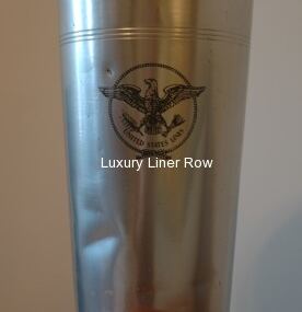 Highly sought-after aluminum stateroom vase from the s.s. United States. Stands 13½” tall and is 7″ in diameter at the mouth. Cabin number U-73 (first class) written on bottom in pen. See archival photo for one in use on board. Typically, the vase has a few dings and a small dent from use on board. The previous owner purchased this at the traveling sale of some fittings shortly before the auction. A exceptional opportunity!
