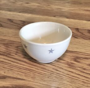 The United States Lines is just about the only company I can think of that offered both double-handled and handle-less bouillon cups for the obligatory deck-chair sip. Why this was done is a mystery to me. Hopefully, one of you can unravel it. It seems odd that a hot liquid like bouillon would be served in a mug without handles, but the original manufacturer’s photos prove it. These are not seen too often, and all are in excellent condition. Made by Lamberton and measuring about 2¼” tall and about 3¾” across.