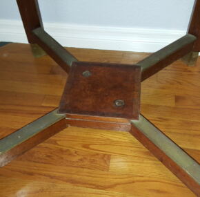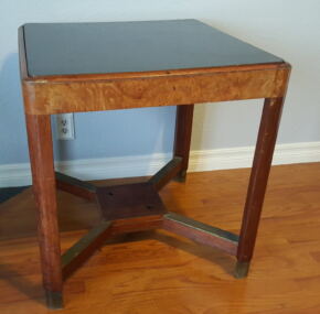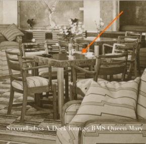 A stunning Art Deco card table from the Queen Mary’s second-class lounge. It is super lovely with amazing veneers. The black formica top is original and flips over to a baize covering for playing cards. It measures about 28.5″ square x 29″ tall. The condition is very good although it has not been restored. I’ve never had one or seen another for sale. This has only had two previous owners — Cunard and the woman who bought it at the RMS Queen Mary sale in the early 1970s. Useful, lovely, and from one of the most famous ships of all time!