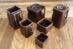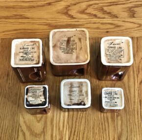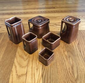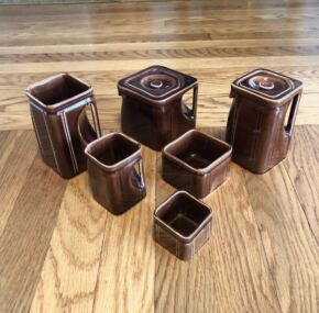 Excellent condition and never that easy to obtain when looking for the entire set. Here is Cunard’s chocolate-brown glazed tea set. Sold in the on-board gift shops, it comes with tea pot, hot water jug (with a lid, interestingly), a hot water jug (without a lid), creamer, sugar, and waste dish. In the famous “cube” pattern Cunard was so fond of and as sold on the RMS Queen Mary and RMS Queen Elizabeth. Made by George Clews in England and sourced by good ol’ Stoniers and Co.