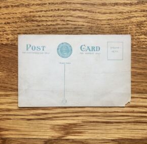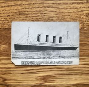 Post-sinking disaster card showing an artist rendering of RMS Olympic. Full details of ship in the caption. Unused with one corner bitten off. This same image was also used on a post-sinking poster, maybe to raise funds for the disaster relief.
