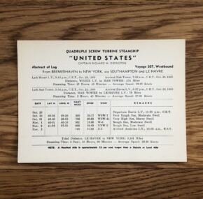 Abstract of log card from the ss United States’s voyage 307, westbound. In near-mint condition. A small quantity available.